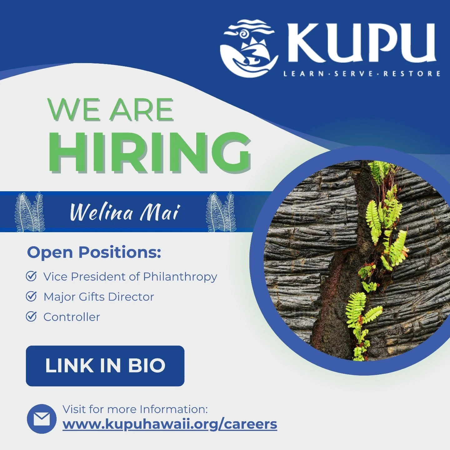 Kupu, meaning to grow, sprout, or increase, connects youth and young adults with opportunities to discover their potential and create a better future for their community, their environment, and themselves. We also support a network of partners who serve youth and ʻāina, helping them achieve their goals.
